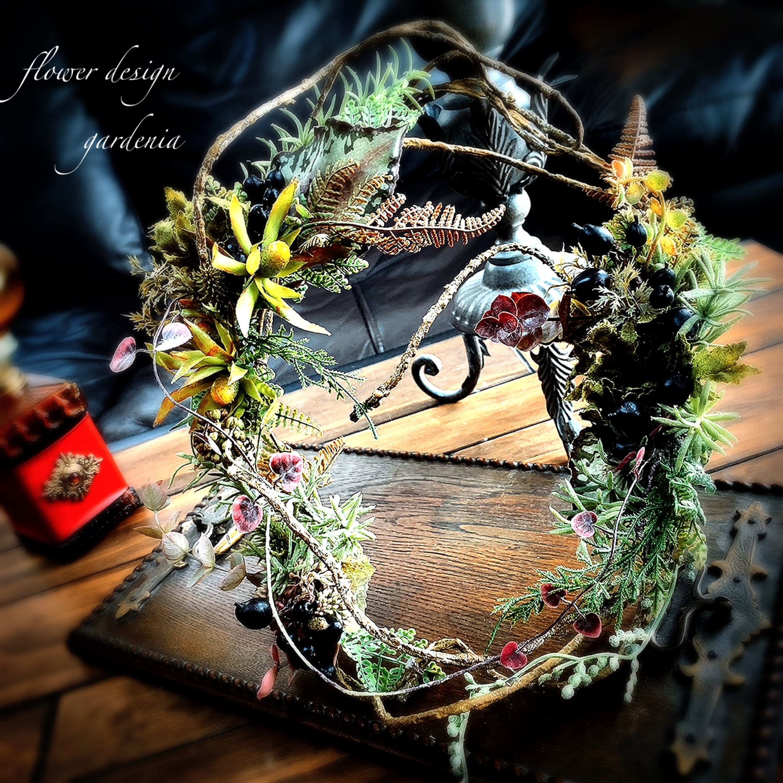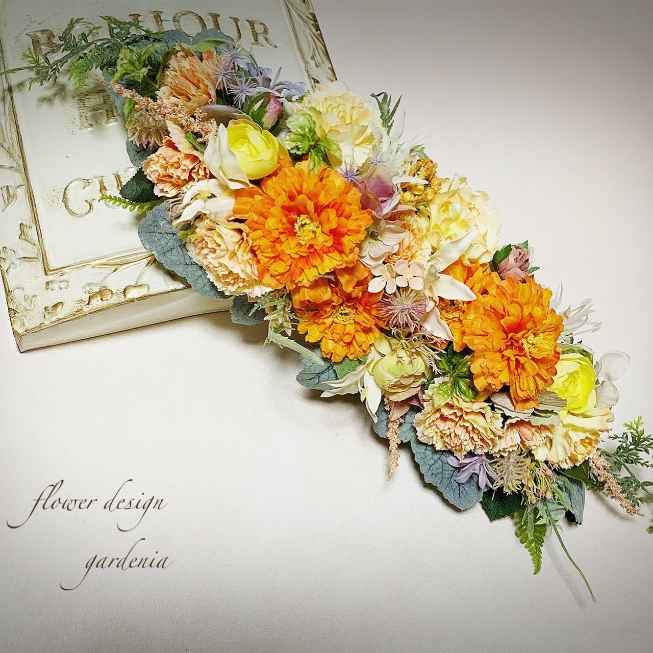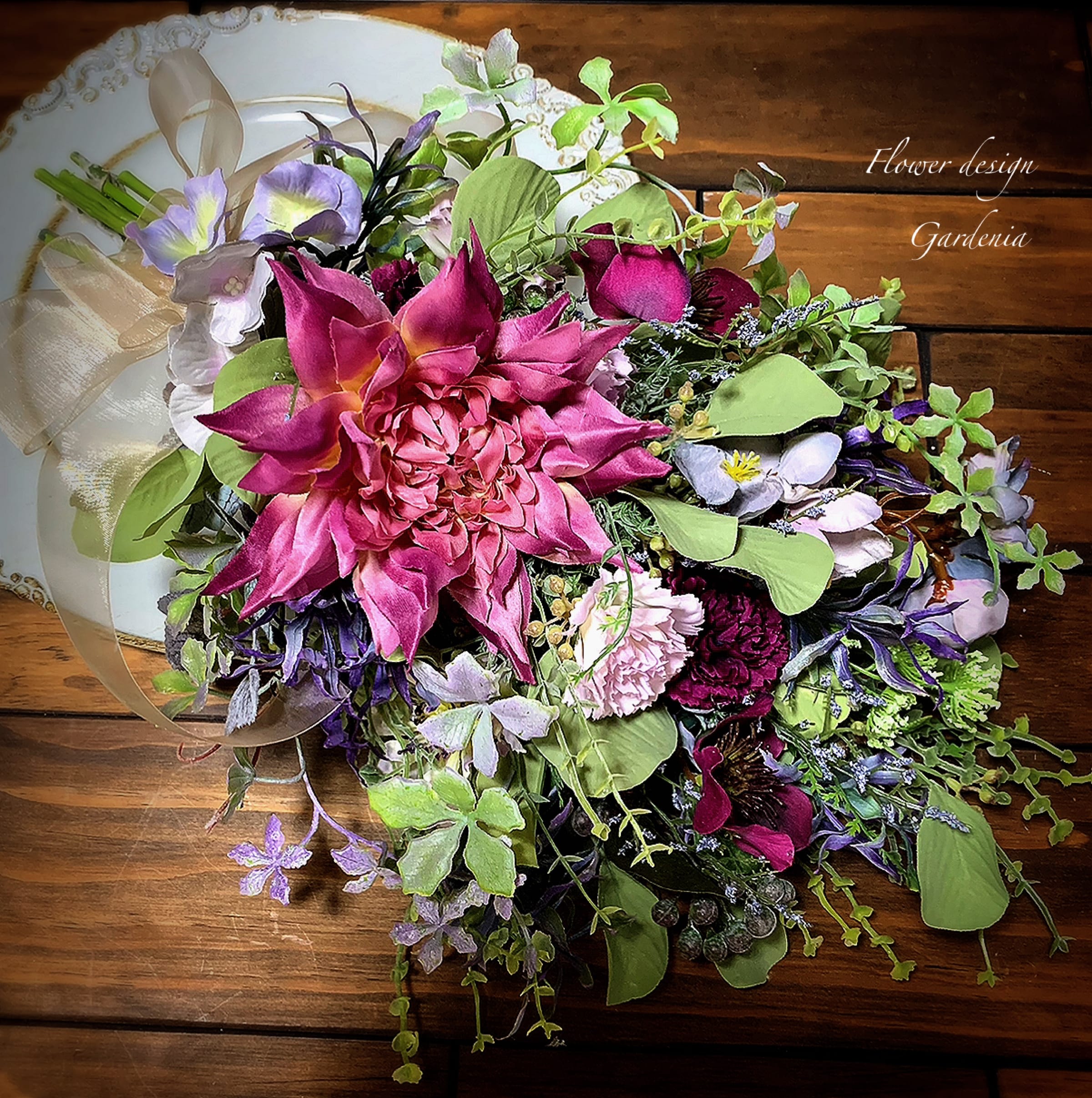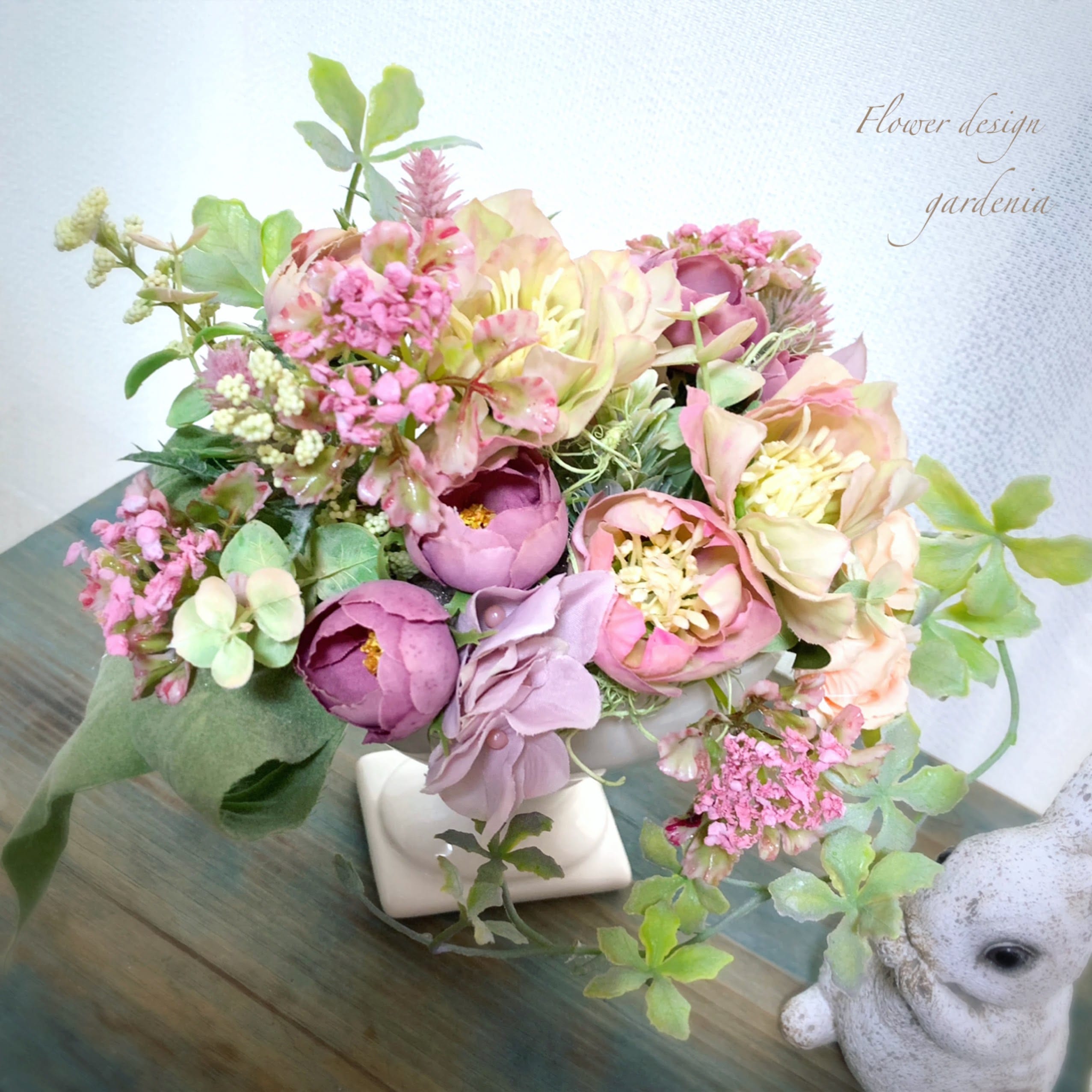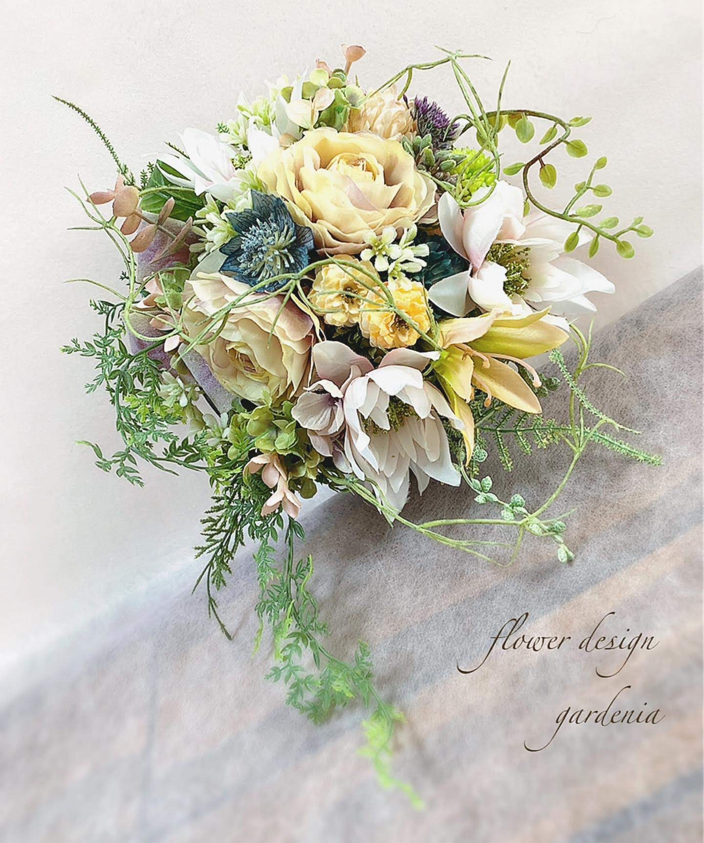 花材はアーティフィシャルフラワーやプリザーブドフラワー、ドライフラワーを使用します。